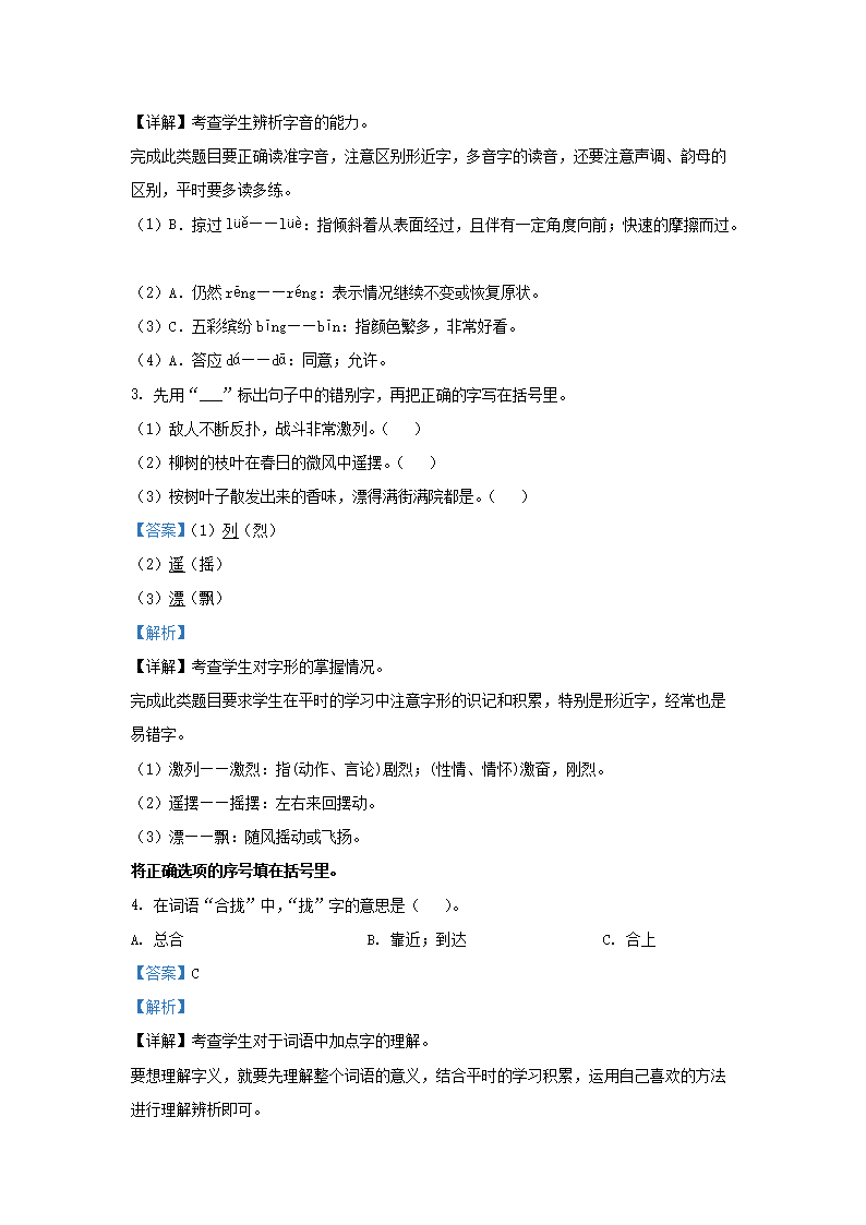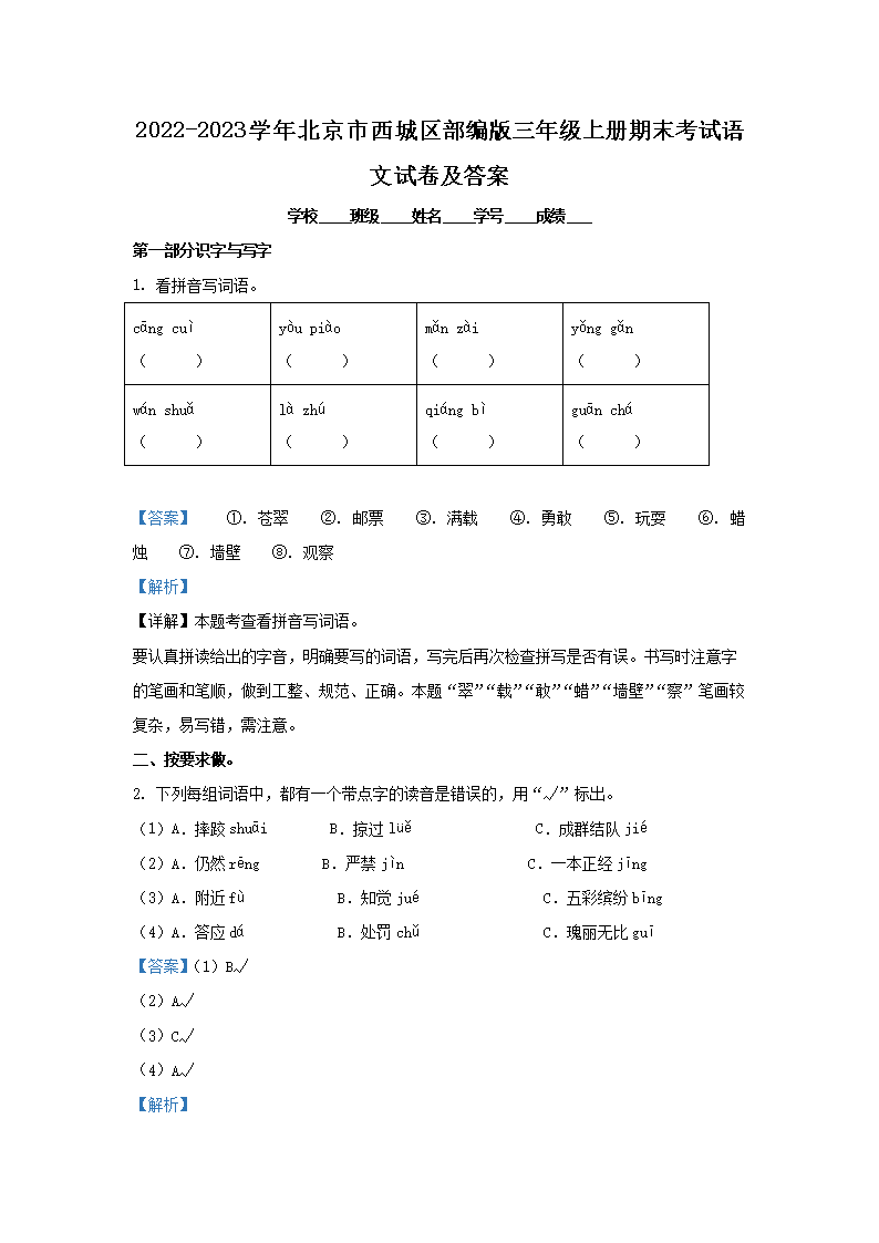 2022-2023学年北京市西城区部编版三年级上册期末考试语文试卷及答案(Word版)06-29