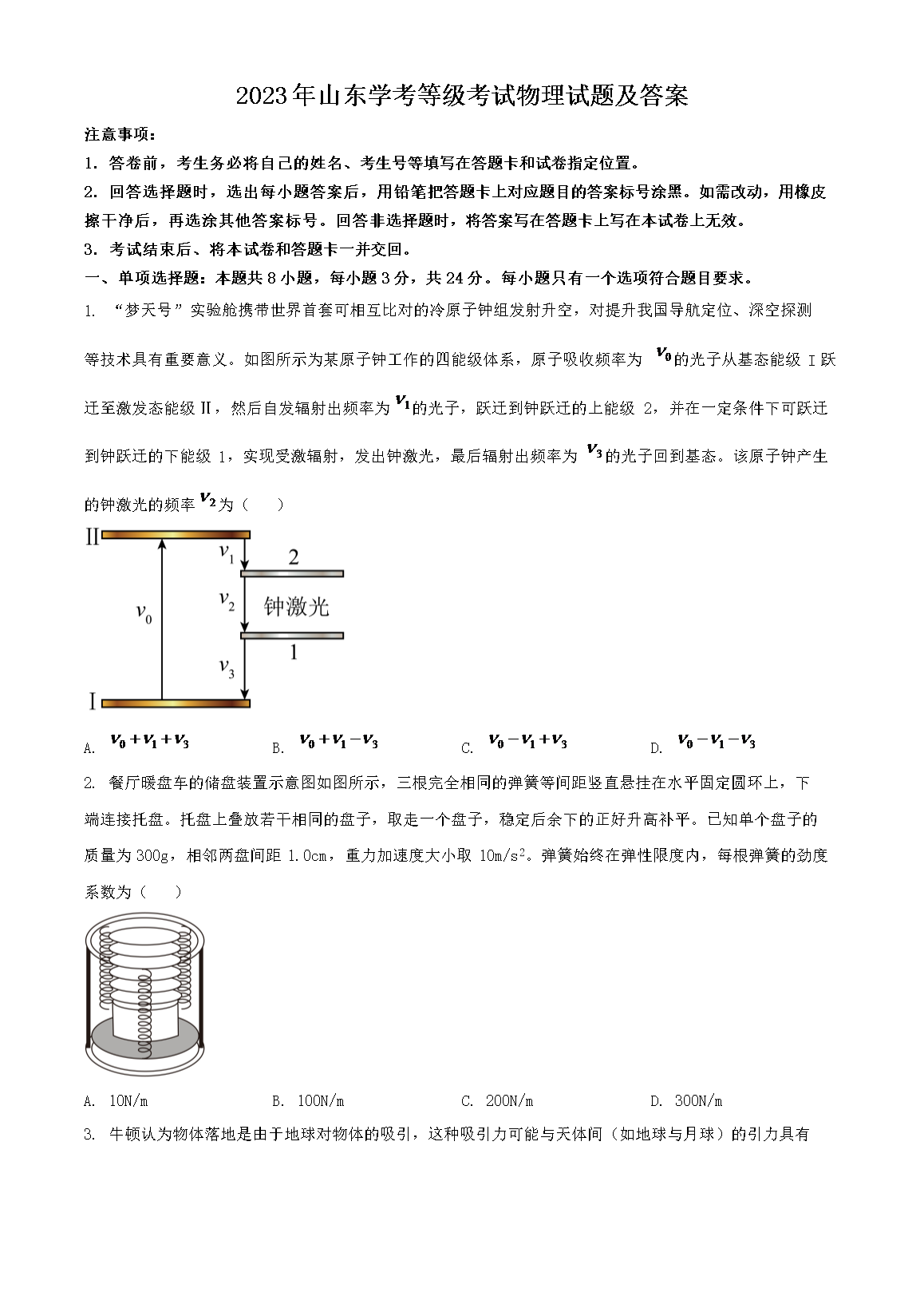 2023年山东学考等级考试物理试题及答案(Word版)06-23