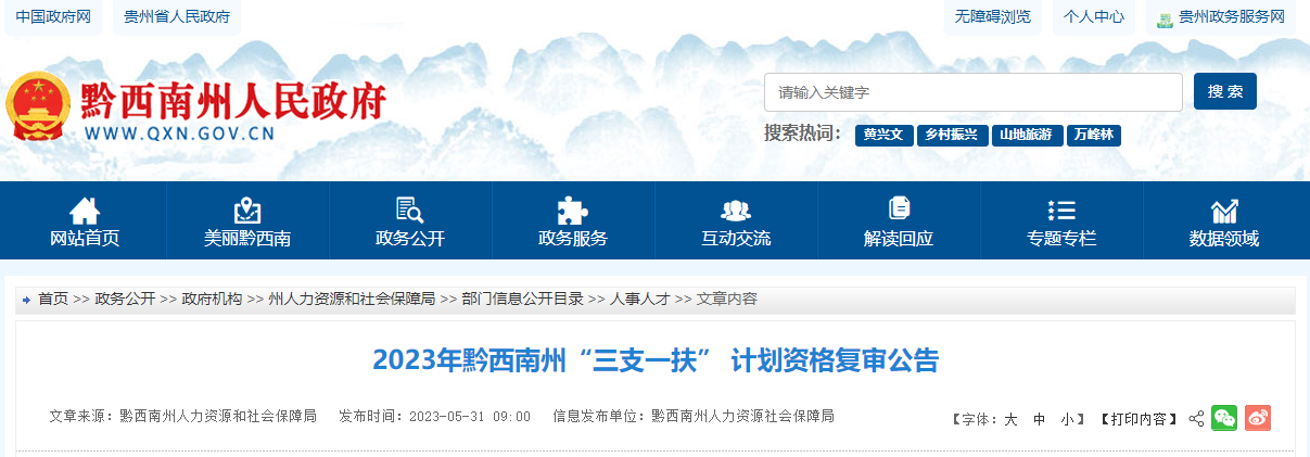 【#三支一扶# 导语】©文档大全网从黔西南州人民政府了解到,2023年贵州黔西南州“三支一扶” 计划资格复审时间:5月31日-6月6日,相关事宜如下:
