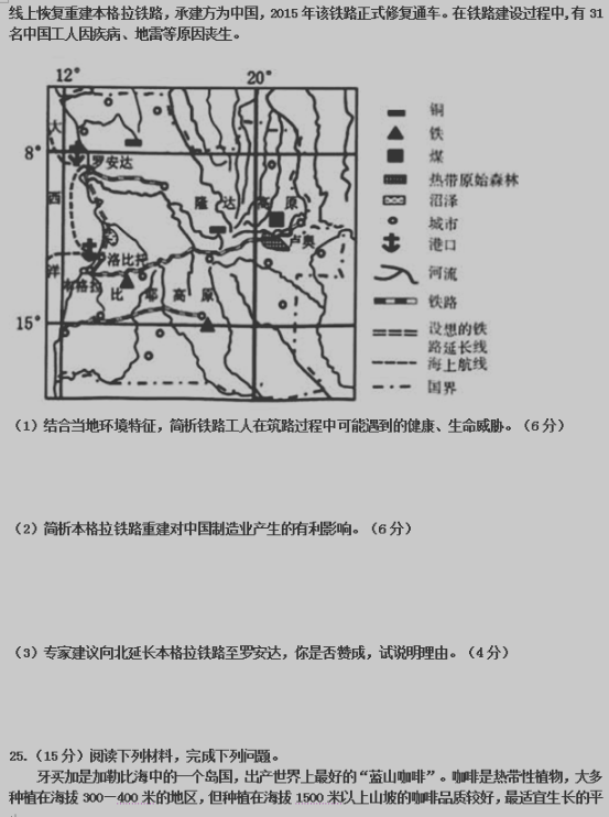 (3)赞成:连接了北部与中部铁路(或连接洛比托和罗安达港口),激活了交通网;利于沿线经济发展,促进安哥拉国内就业;沿海多平原,利于铁路施工。
