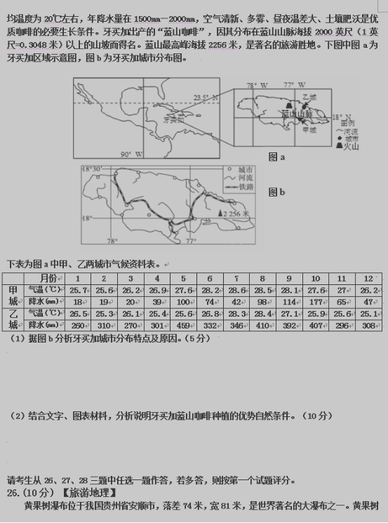 (2)岛上有火山分布,有肥沃的火山土壤;(2分)蓝山山脉海拔2000米以上,有适宜蓝山咖啡种植的山坡地形;(2分)地处热带山地,年平均气温在20°左右,昼夜温差大,温度适宜优质咖啡生长;(2分)年降水量较大,多雾,适宜咖啡生长;(2分)周围海洋环绕,海拔较高,空气清新,没有污染,咖啡品质优良。(2分)