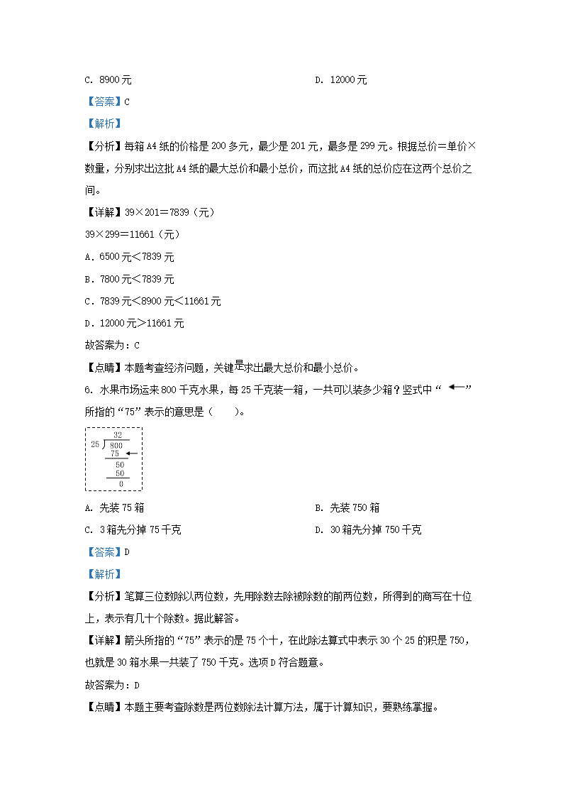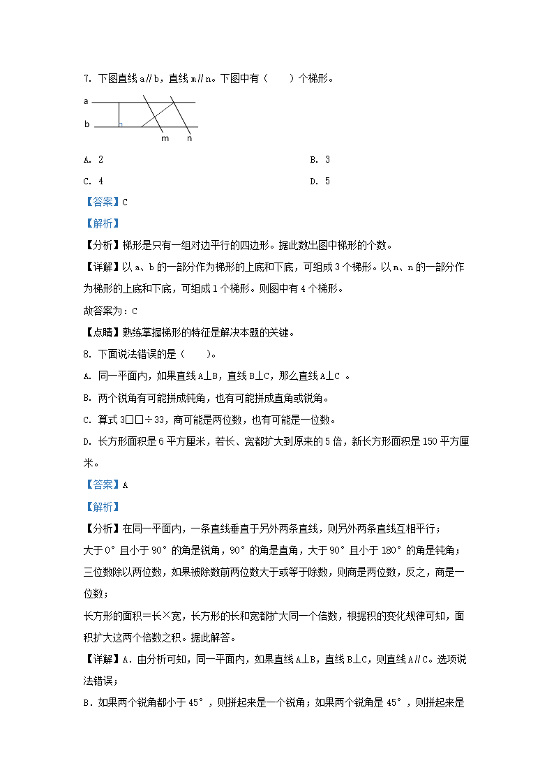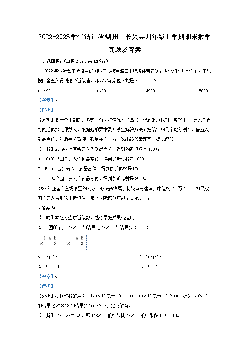 2022-2023学年浙江省湖州市长兴县四年级上学期期末数学真题及答案(Word版)09-29