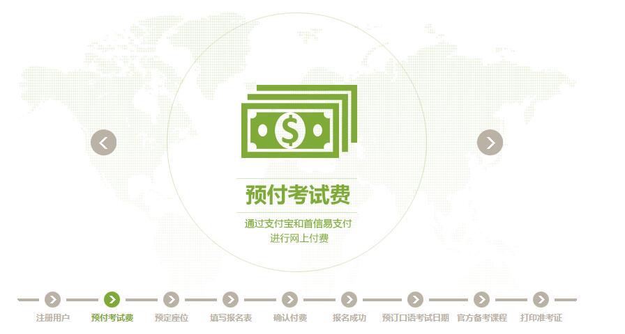 根据不同的使用目的,选择相应考试类型并预付相应的考试费用。通过支付宝和首信易支付进行网上付费,付费后系统会及时确认费用到账。(了解不同考试类型,请点击这里)