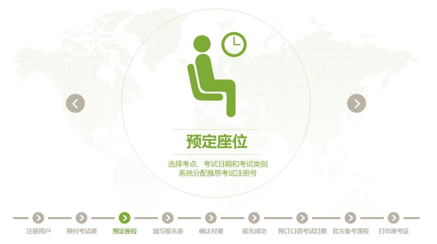 选择考点、考试日期和考试类别。每预定一次考位,系统会分配一个雅思考试注册号,并显示在"我的状态"页面,这是享受雅思考试服务的凭据之一。