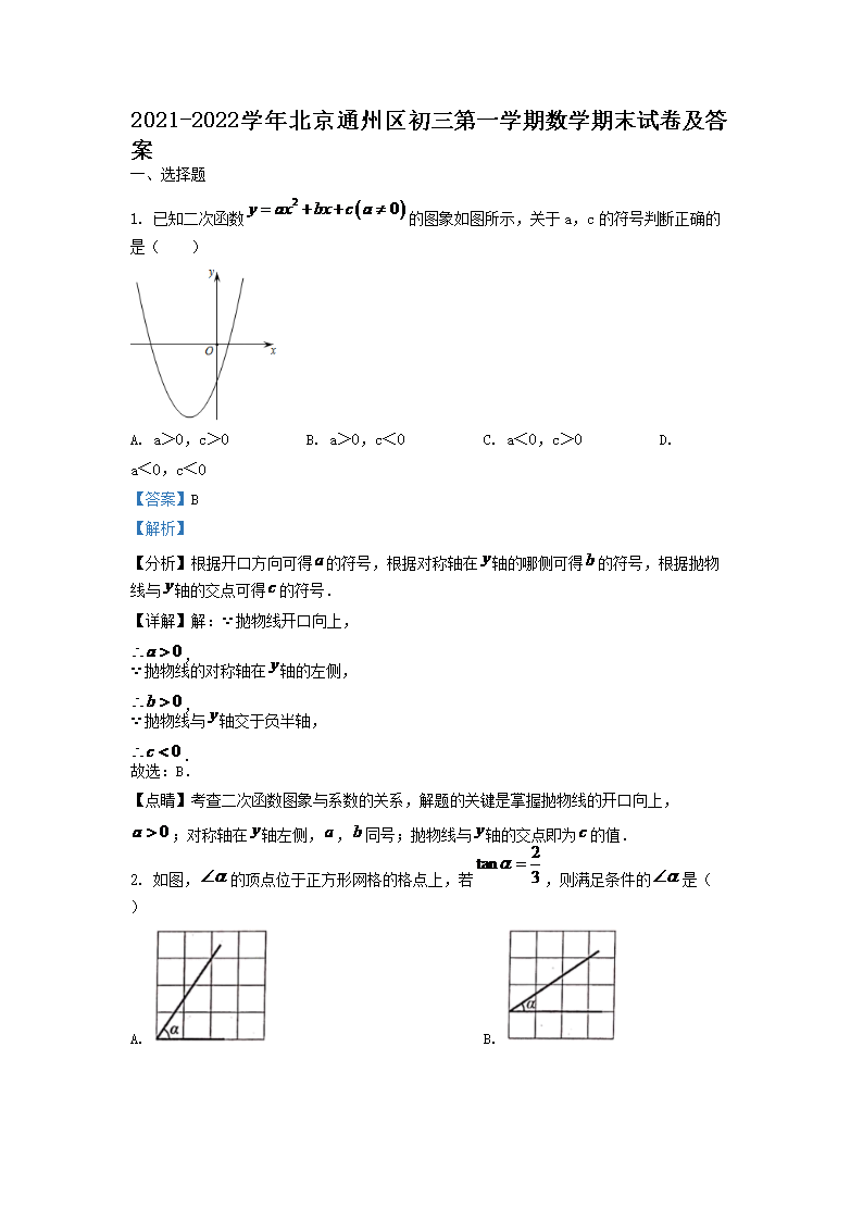 2021-2022学年北京通州区初三第一学期数学期末试卷及答案(Word版)07-04
