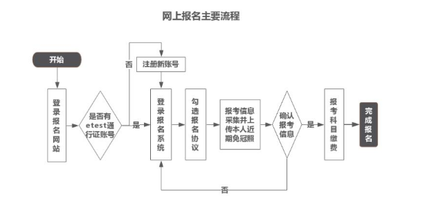 考生通过报名系统完成用户注册、信息填报、选择考点、选择报考科目、上传照片、网上缴费等报名程序。考生可查询各考点的考试科目、限报科次、限报人数等相关信息,根据本人情况选择考点报考。报名时间截止后,报名系统将自动关闭。