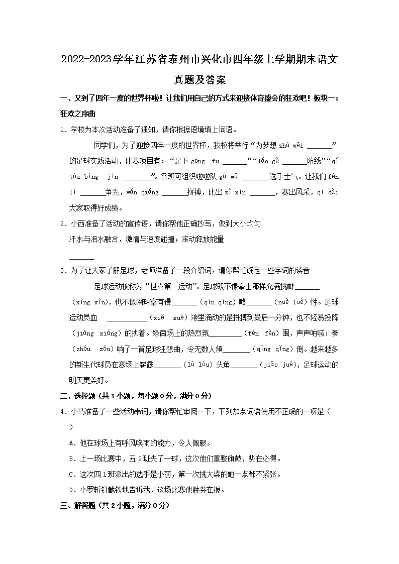 2022-2023学年江苏省泰州市兴化市四年级上学期期末语文真题及答案(Word版)09-16