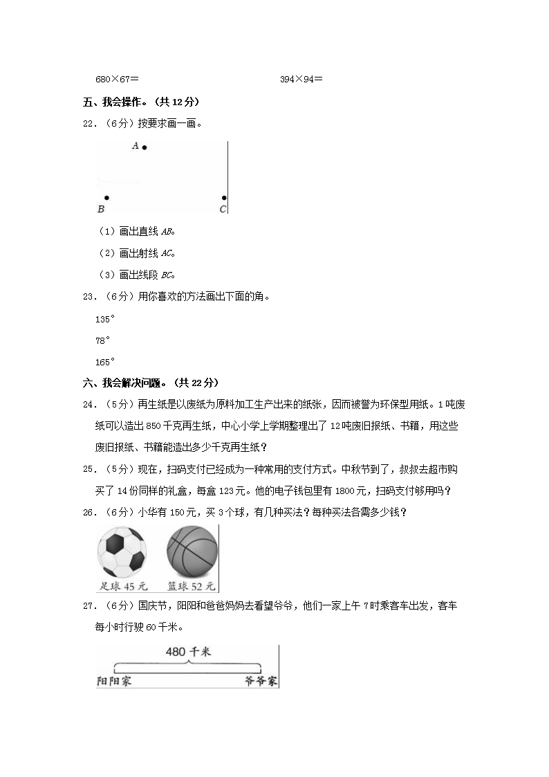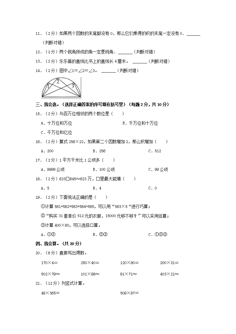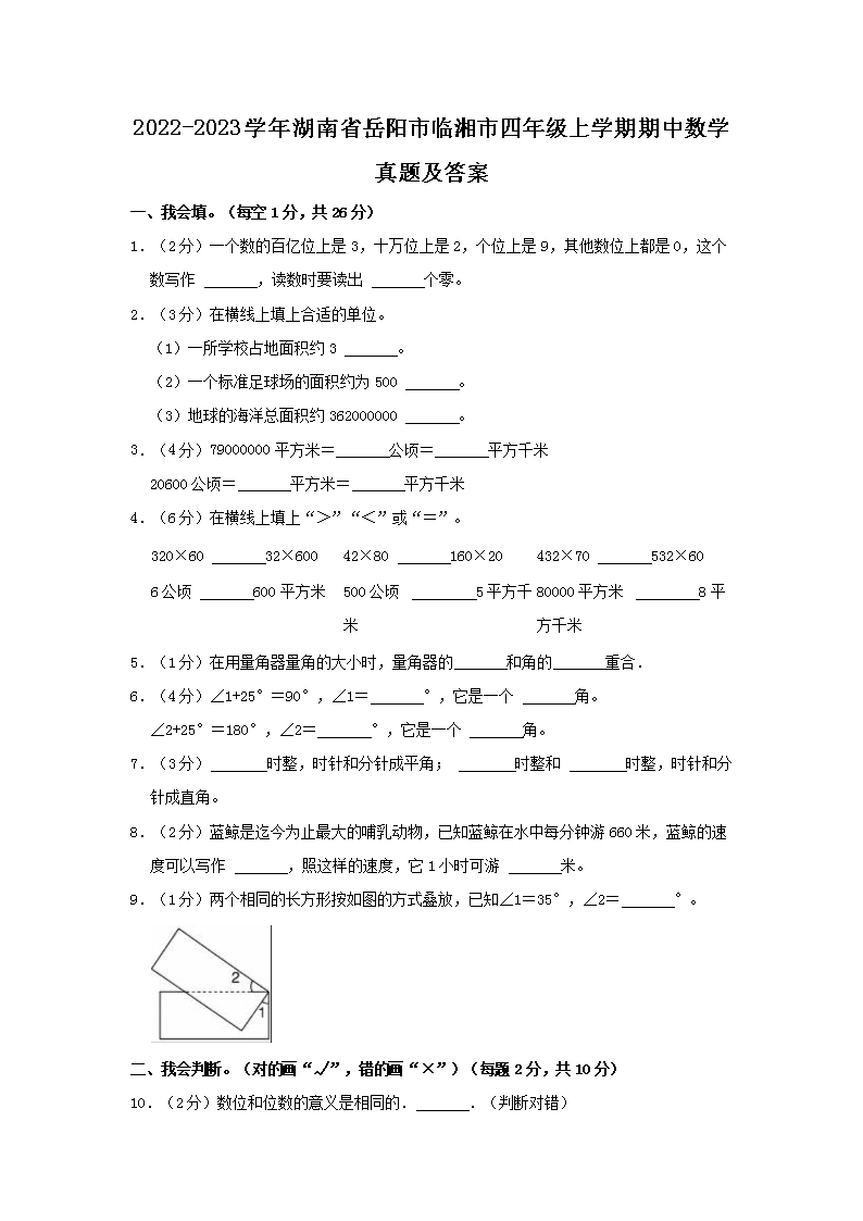2022-2023学年湖南省岳阳市临湘市四年级上学期期中数学真题及答案(Word版)10-14