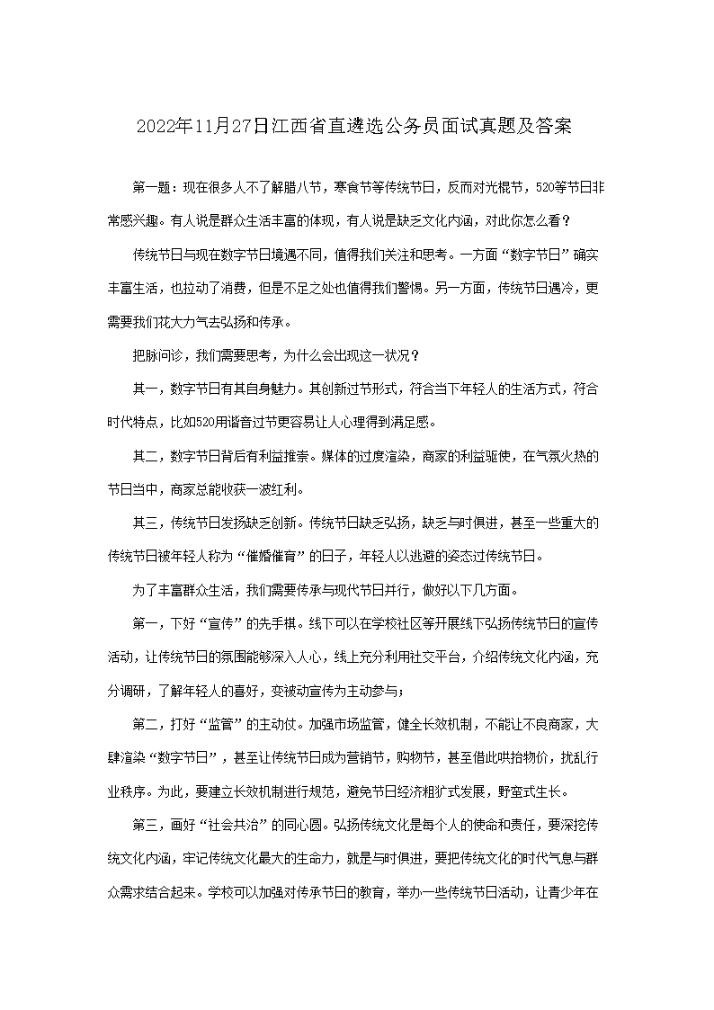 【文档预览】 文档大全网整理发布2022年11月27日江西省直遴选公务员面试真题及答案(Word版),前五页预览如下: