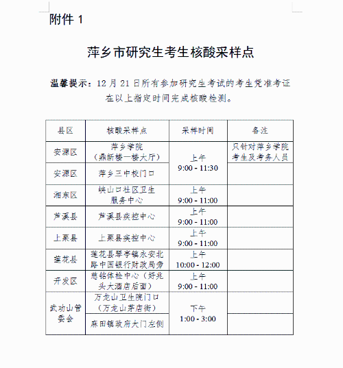 2.根据教育部、省教育考试院防疫要求,考生须提供首场考试前72小时内在赣期间核酸检测阴性证明。所有参加考试的考生必须在12月21日做1次“单人单管”核酸采样,请在指定时间和地点内完成(见附件1)。无法前往指定核酸采样点的考生,请于12月21日自行在其他采样点完成“单人单管”核酸采样。在采样过程中要做好个人防护,保持与他人的间距。
