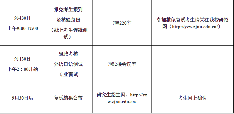 第一批:9月28日-30日:学院审核确定参加复试名单,发出复试通知,组织复试,根据学生的学术研究能力与发展潜力等方面综合考虑,评定复试成绩。复试安排具体详见日程安排。