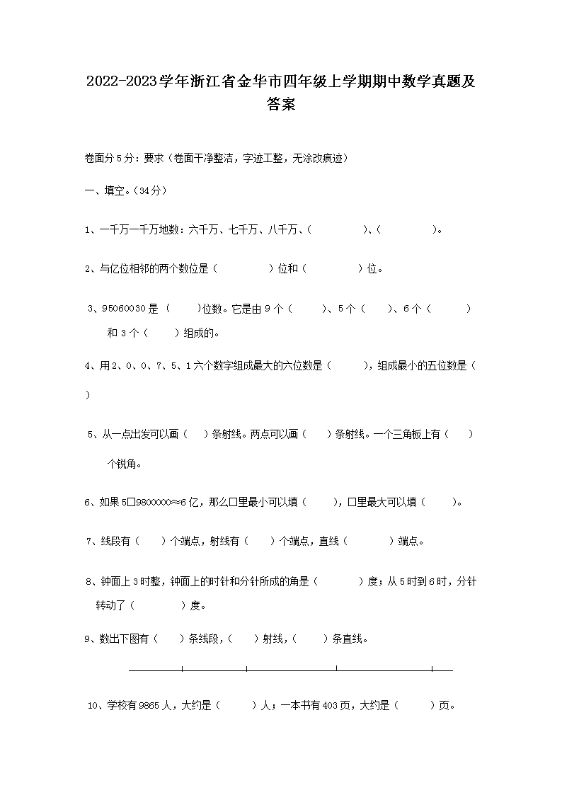 【文档预览】 文档大全网整理发布2022-2023学年浙江省金华市四年级上学期期中数学真题及答案(Word版),前五页预览如下: