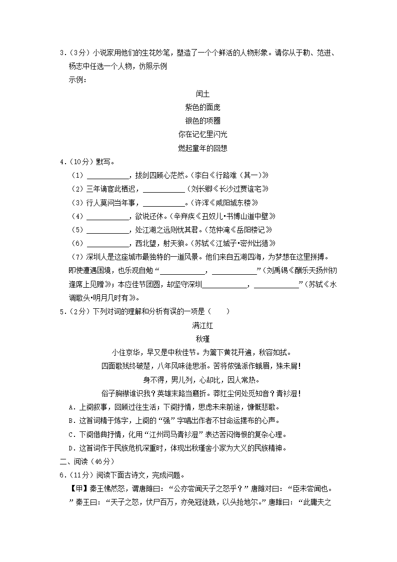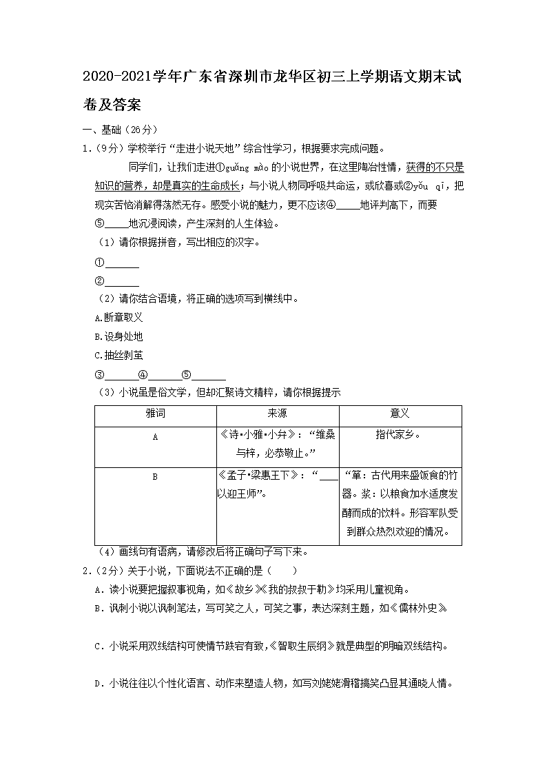 2020-2021学年广东省深圳市龙华区初三上学期语文期末试卷及答案(Word版)08-18