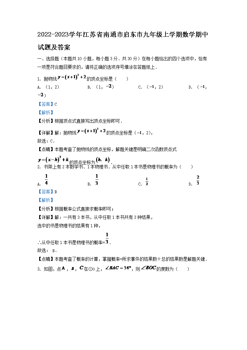 【文档预览】 文档大全网整理发布2022-2023学年江苏省南通市启东市九年级上学期数学期中试题及答案(Word版),前五页预览如下:
