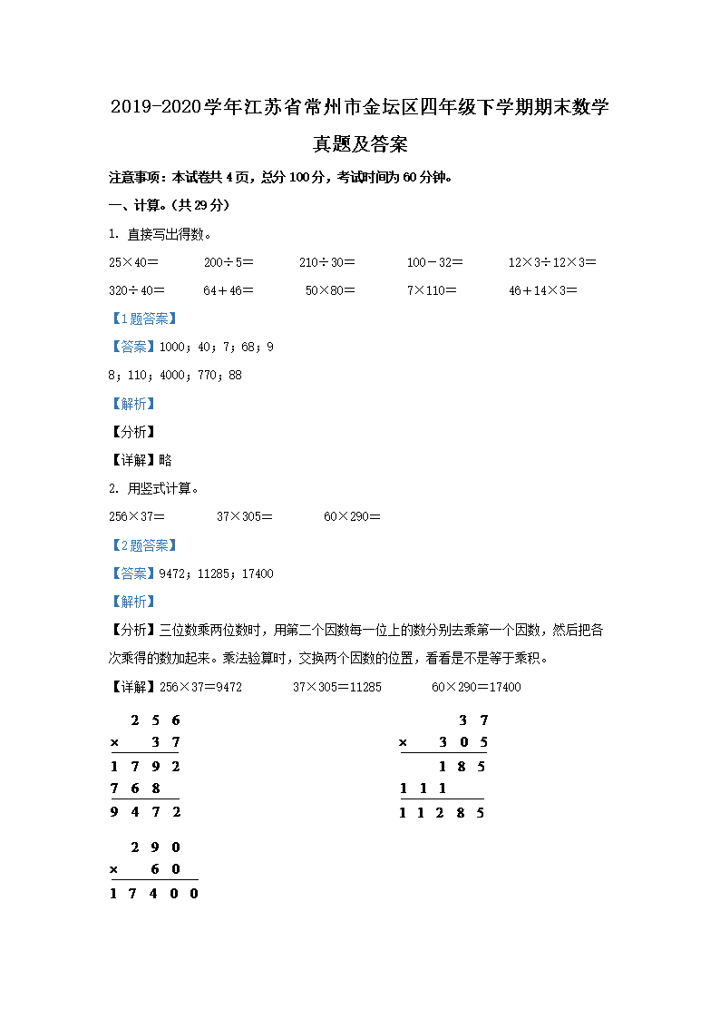 【文档预览】 文档大全网整理发布2019-2020学年江苏省常州市金坛区四年级下学期期末数学真题及答案(Word版),前五页预览如下: