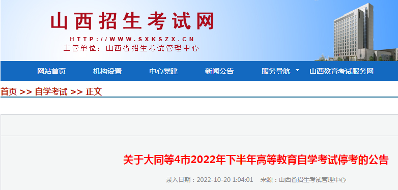 目前我省疫情总体态势严峻复杂,根据省、市疫情防控部署要求,为切实保障广大考生和考试工作人员的生命安全和身体健康,经审慎研判,报请省政府同意并向教育部备案,决定停考大同、朔州、临汾、运城等4市2022年10月22日至25日举行的高等教育自学考试,其余7市正常组织考试。