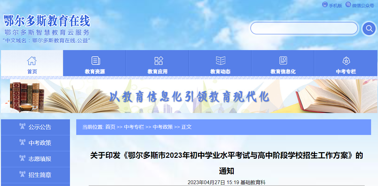 原文标题:关于印发《鄂尔多斯市2023年初中学业水平考试与高中阶段学校招生工作方案》的通知