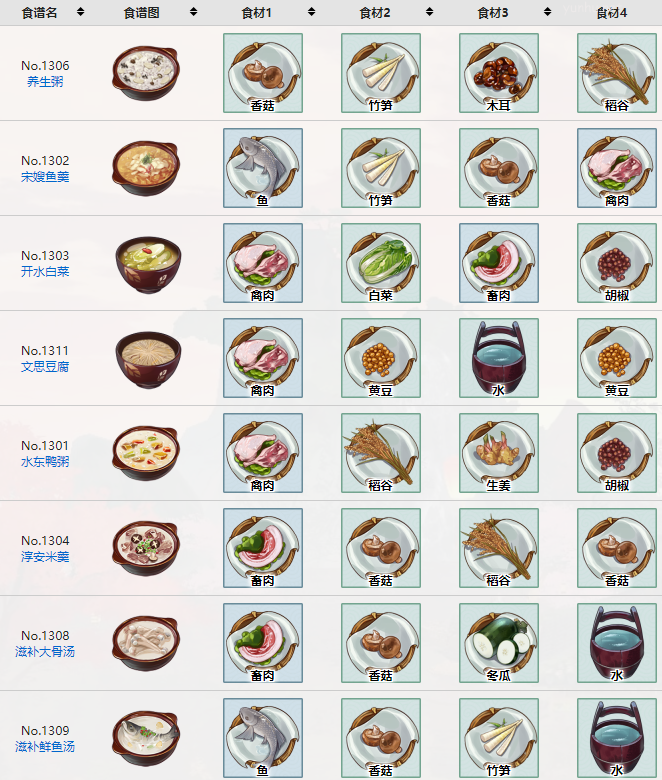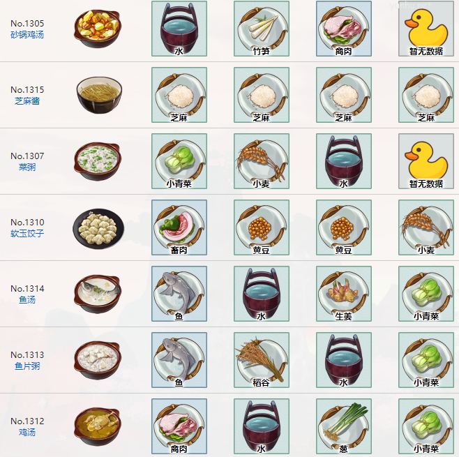 食谱配方:如图所示,有些只有2、3个材料的食物也是可以制作的,只不过品质更低