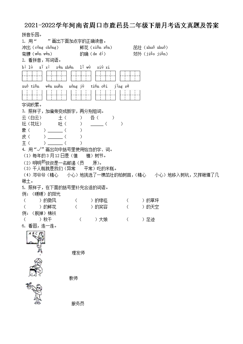 2021-2022学年河南省周口市鹿邑县二年级下册月考语文真题及答案(Word版)07-28