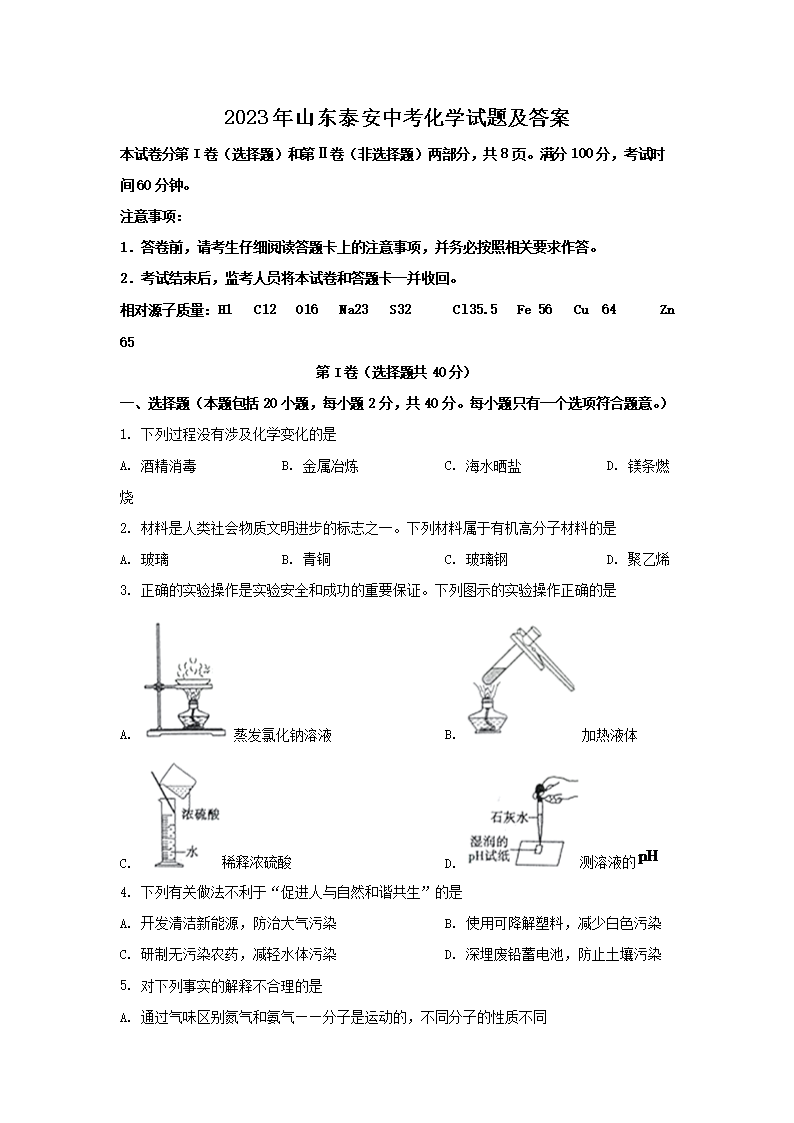 2023年山东泰安中考化学试题及答案(Word版)08-09