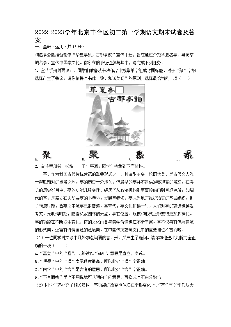 【文档预览】 文档大全网整理发布2022-2023学年北京丰台区初三第一学期语文期末试卷及答案(Word版),前五页预览如下: