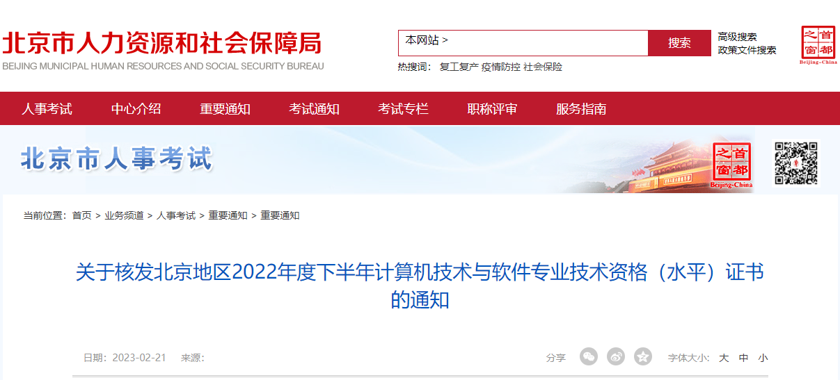 原文标题:关于核发北京地区2022年度下半年计算机技术与软件专业技术资格(水平)证书的通知