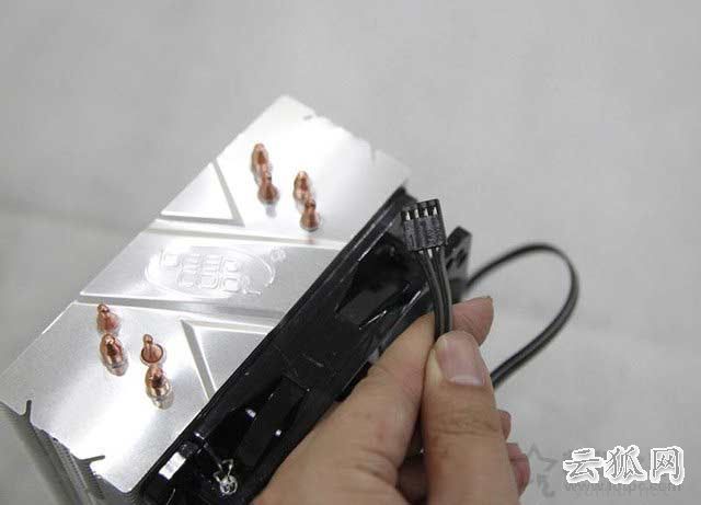 9、找到九州风神玄冰400散热器上的供电插口,我们将其插到主板的CPU_FAN的接口上,否者风扇不能供电导致不转。
