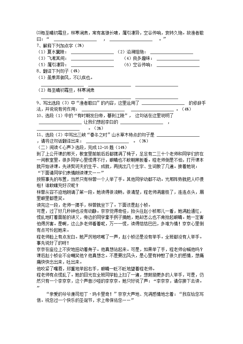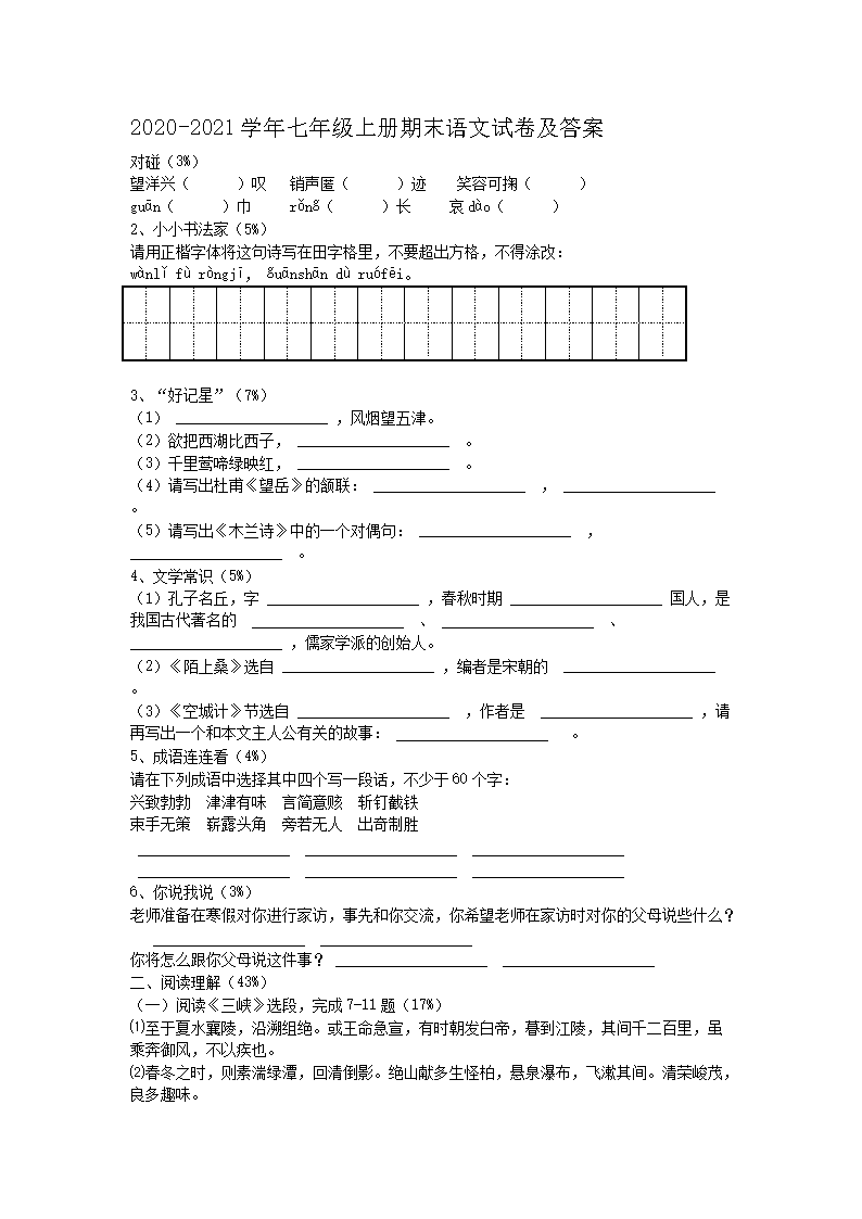 【文档预览】 文档大全网整理发布2020-2021学年七年级上册期末语文试卷及答案(Word版),前五页预览如下:
