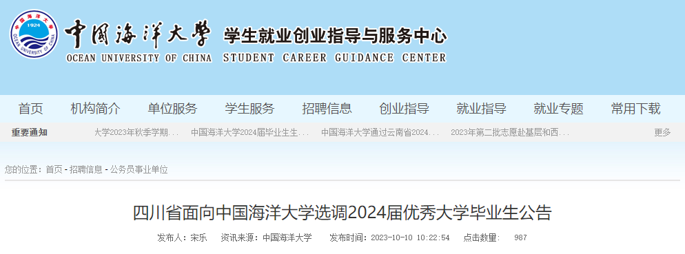 四川省面向中国海洋大学选调2024届优秀大学毕业生公告10-13