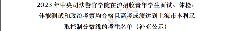 点击查看:2023 年中央司法警官学院在沪招收青年学生面试、体检、 体能测试和政治考察均合格且高考成绩达到上海市本科录 取控制分数线的考生名单(补充公示)