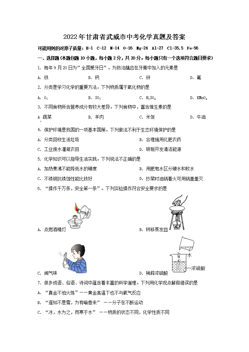 【文档预览】 文档大全网整理发布2022年甘肃省武威市中考化学真题及答案(Word版),前五页预览如下: