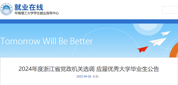 【#公务员考试# #2024年浙江省党政机关选调生报名时间及报名入口[2023年10月9日-20日]#】华南理工大学就业指导中心发布了《2024年浙江省党政机关选调应届优秀大学毕业生公告》,©文档大全网从公告中获悉,2024年浙江省党政机关选调生报名时间:2023年10月9日-20日,考试时间:11月12日,具体事宜详见《招考公告》,小编在此将相关信息摘录如下,预祝大家考试顺利!