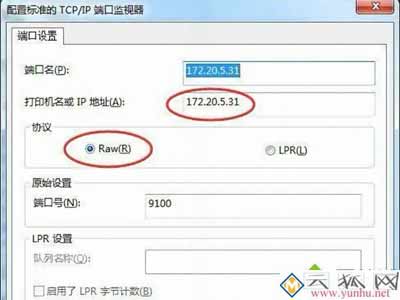 4、在端口设置窗口,可修改端口名称、打印机名称或IP地址。选择协议:激光打印机是RAW,针式打印机是LPR(一般保持默认即可)。