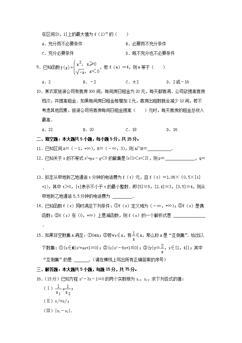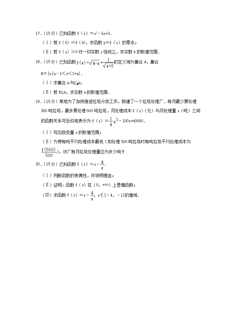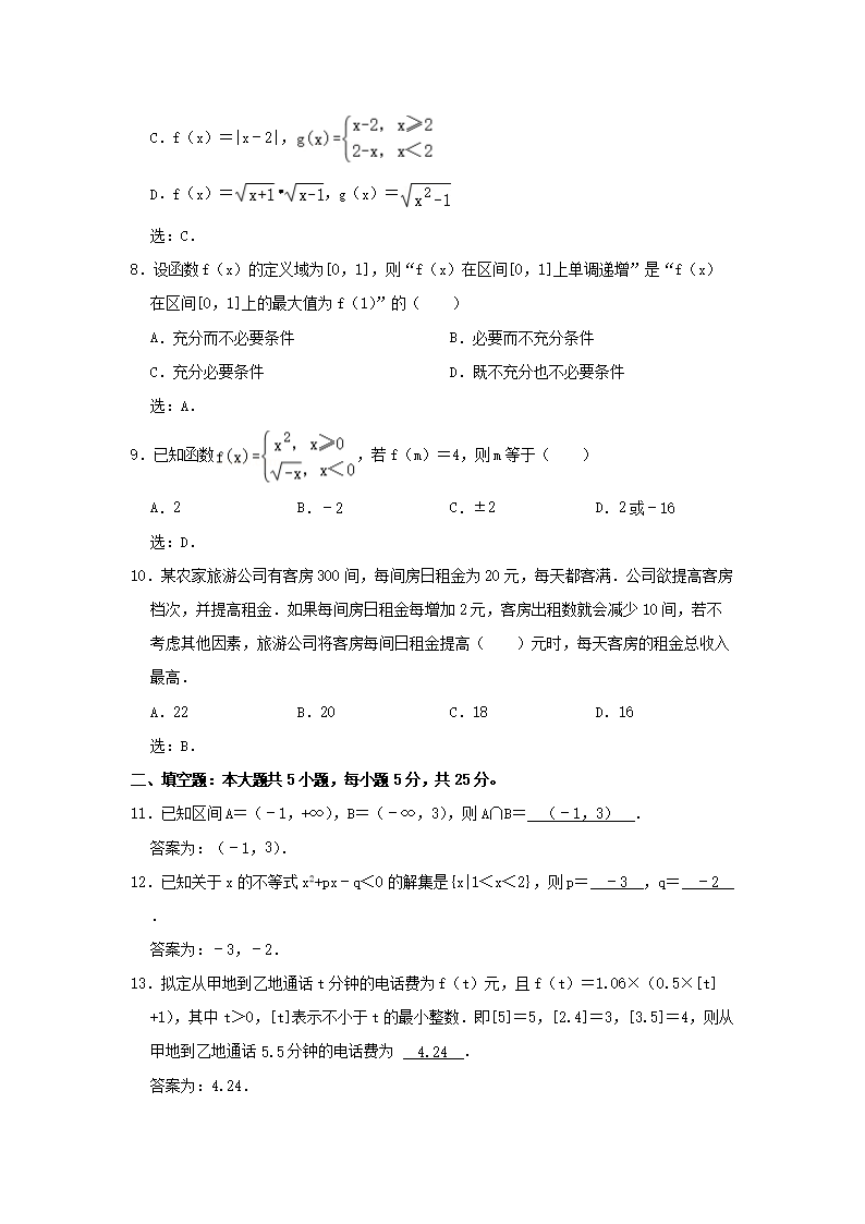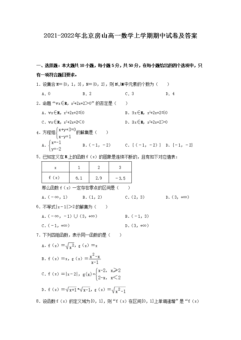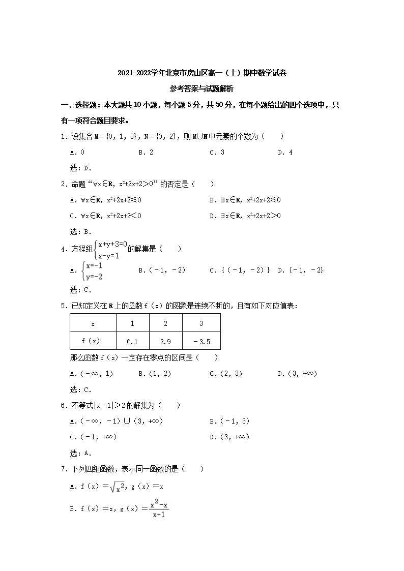 2021-2022年北京房山高一数学上学期期中试卷及答案(Word版)10-24