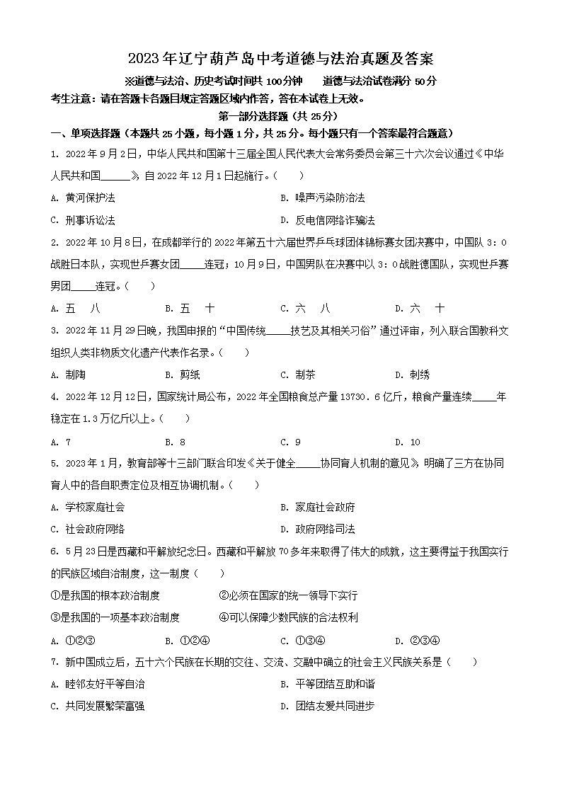 【文档预览】 文档大全网整理发布2023年辽宁葫芦岛中考道德与法治真题及答案(Word版),前五页预览如下: