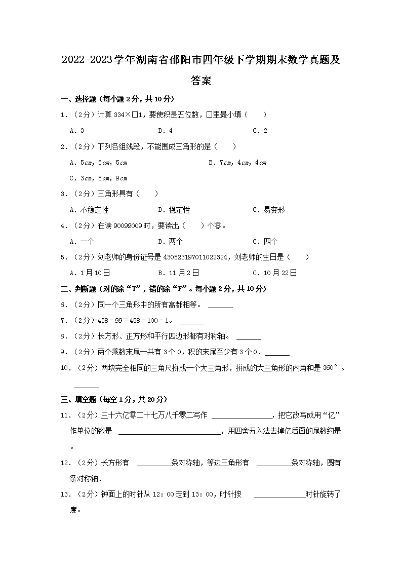2022-2023学年湖南省邵阳市四年级下学期期末数学真题及答案(Word版)10-13