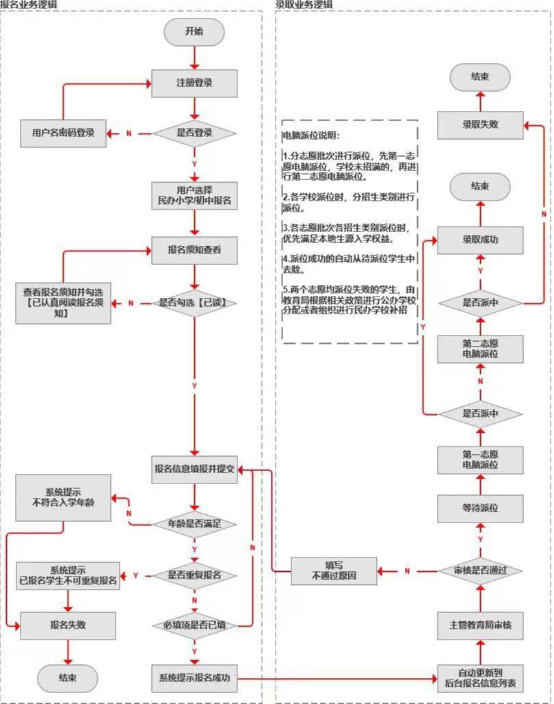 开始—注册登录—选民办小学/初中报名—报名须知查看并勾选—报名信息填报并提交—报名成功。