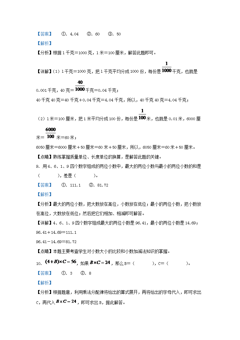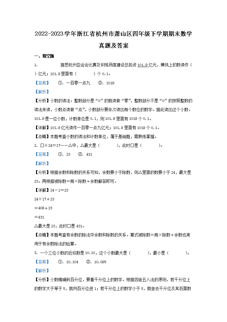 2022-2023学年浙江省杭州市萧山区四年级下学期期末数学真题及答案(Word版)10-09