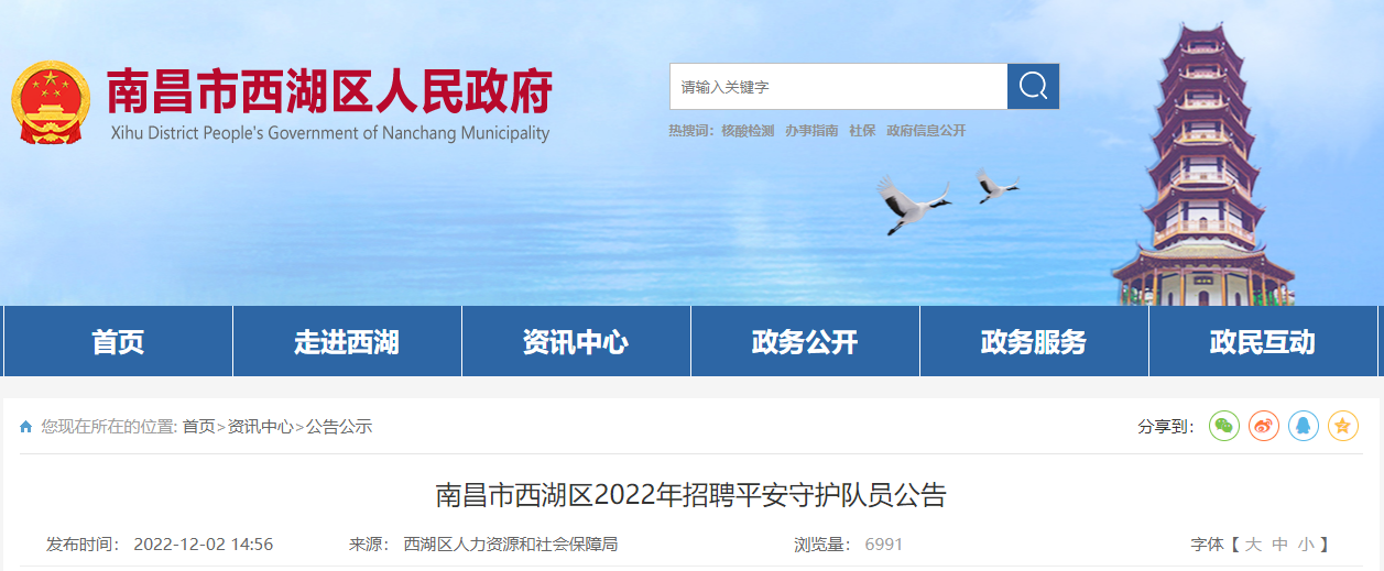 2022年江西南昌市西湖区招聘平安守护队员公告(报名时间12月5日-9日)12-06