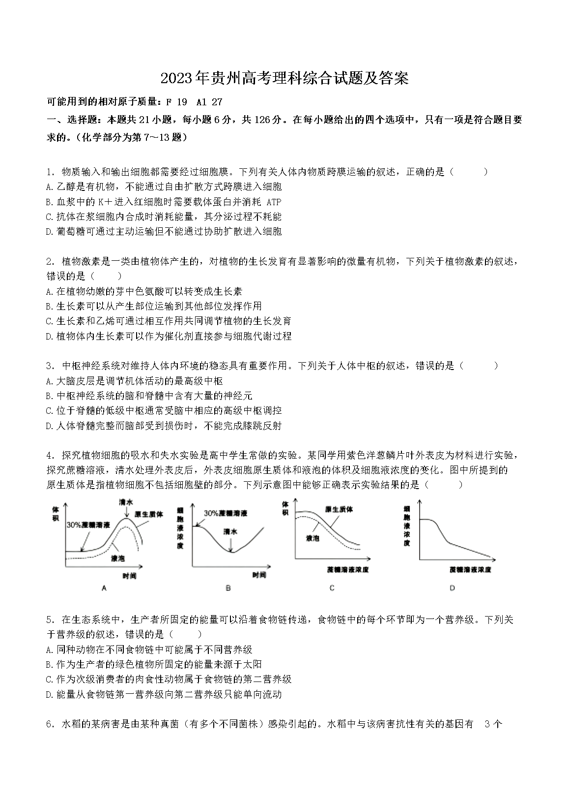 2023年贵州高考理科综合试题及答案(Word版)06-12