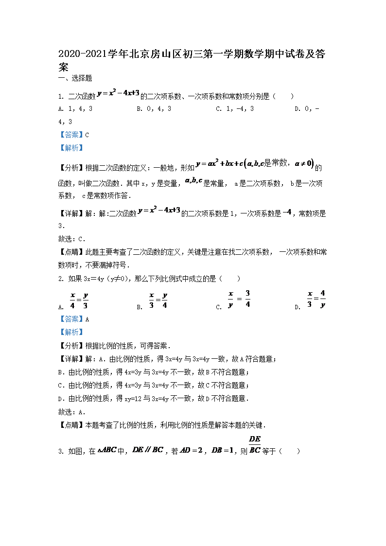 2020-2021学年北京房山区初三第一学期数学期中试卷及答案(Word版)07-26
