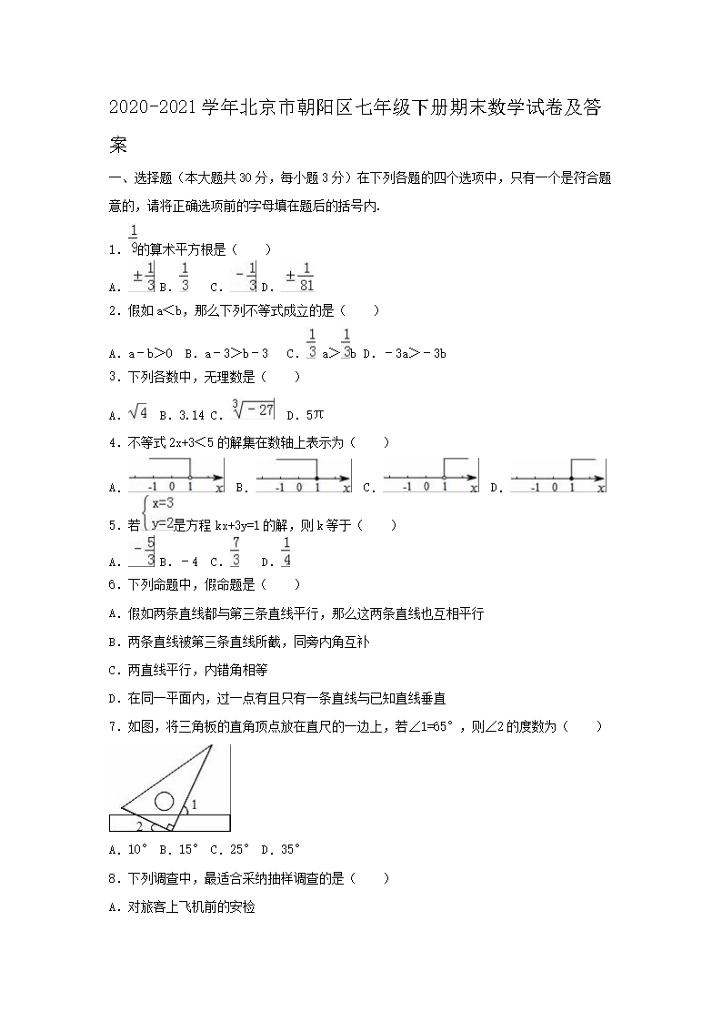 2020-2021学年北京市朝阳区七年级下册期末数学试卷及答案(Word版)07-01