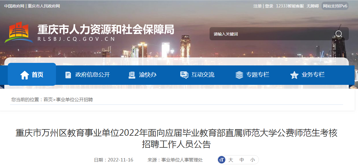 2022重庆万州教育事业单位面向应届毕业教育部直属师范大学公费师范生招聘工作人员公告11-18