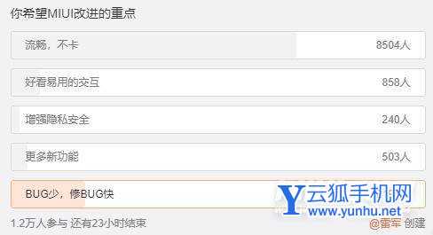 根据小米雷军发布的调查显示大家对于即将推出的MIUI13系统希望改进重点第一个就是流畅不卡,第二就是bug少,修复bug快。