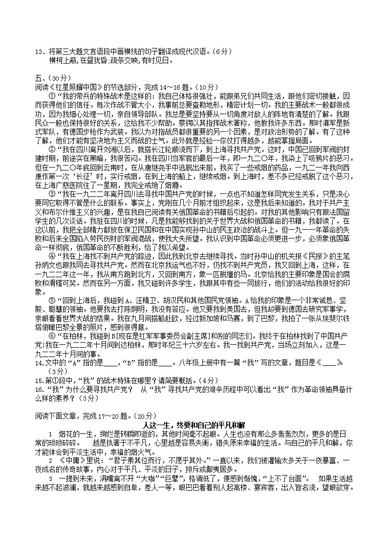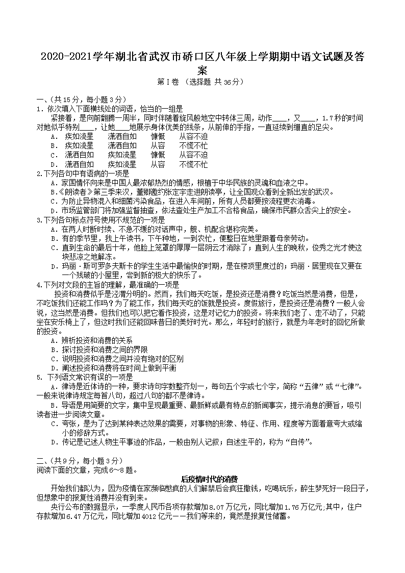 2020-2021学年湖北省武汉市硚口区八年级上学期期中语文试题及答案(Word版)10-17