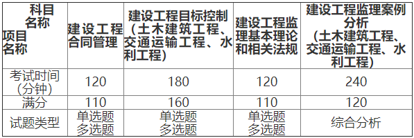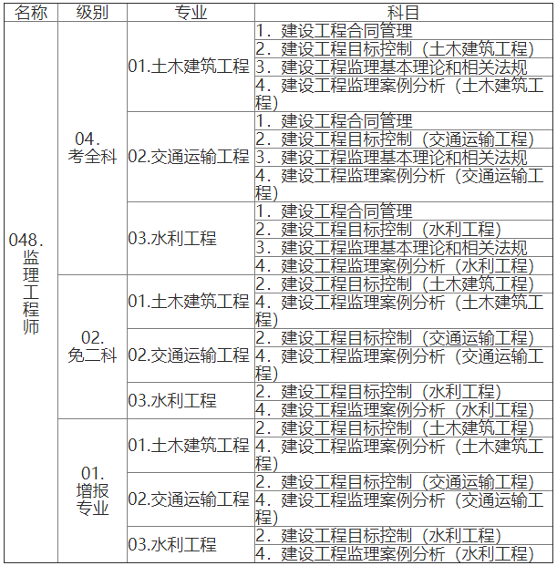 监理工程师职业资格考试设《建设工程监理基本理论和相关法规》(客观题)、《建设工程合同管理》(客观题)、《建设工程目标控制》(客观题)和《建设工程监理案例分析》(主观题)4个科目(见附件4)。其中《建设工程监理基本理论和相关法规》和《建设工程合同管理》为基础科目;《建设工程目标控制》和《建设工程监理案例分析》为专业科目。专业类别分为土木建筑工程、交通运输工程和水利工程,报考人员可根据实际工作需要选报其一。监理工程师职业资格考试成绩实行4年为一个周期的滚动管理办法,参加4个科目考试(级别为考全科)的人员须在连续4个考试年度内通过全部应试科目,参加2个科目考试(级别为免二科)的符合免试基础科目人员须在连续2个考试年度内通过相应应试科目,方可获得资格证书。已取得监理工程师一种专业职业资格证书的人员,报名参加其他专业科目考试的(级别为增报专业),可免考基础科目,在连续2个考试年度内通过相应应试科目,可获得相应专业考试合格证明,该证明作为注册时增加执业专业类别的依据。