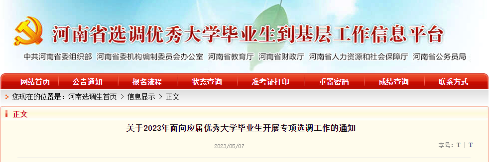 【#选调生# 导语】®文档大全网从河南省毕业生就业信息网了解到,《2023年河南面向应届优秀大学毕业生开展专项选调工作的通知》现已公布!2023年河南专项选调生体检及考察工作安排如下: