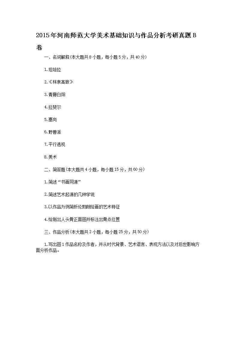 2015年河南师范大学美术基础知识与作品分析考研真题B卷(Word版)06-01