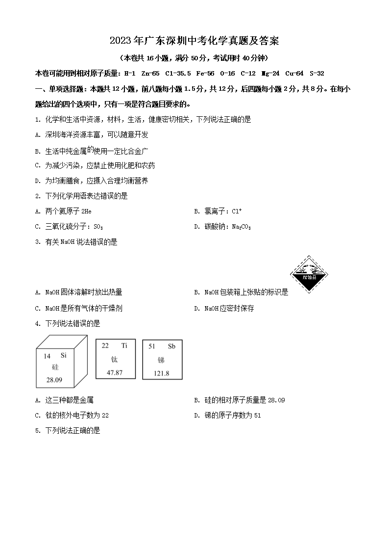 2023年广东深圳中考化学真题及答案(Word版)07-01