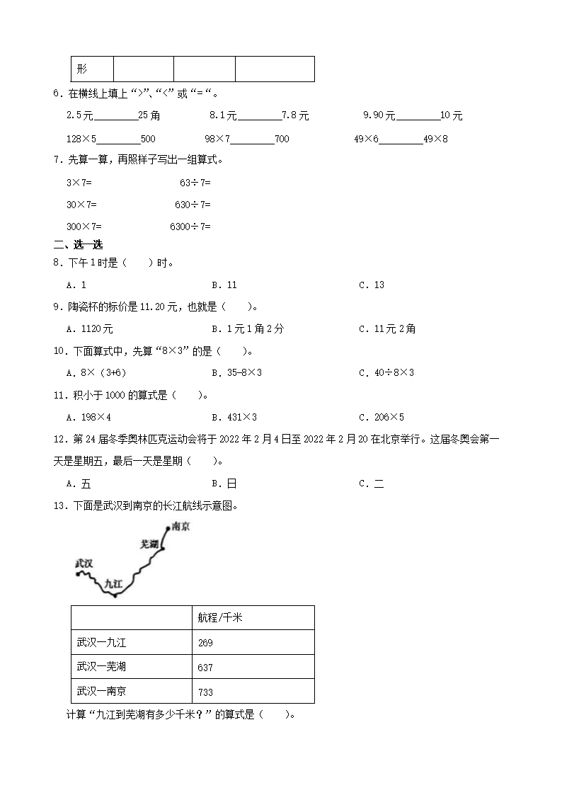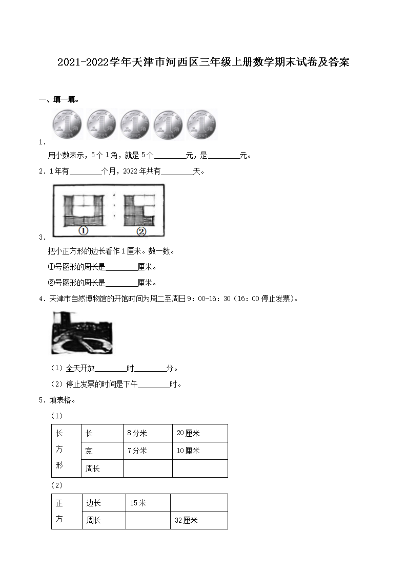 2021-2022学年天津市河西区三年级上册数学期末试卷及答案(Word版)06-17